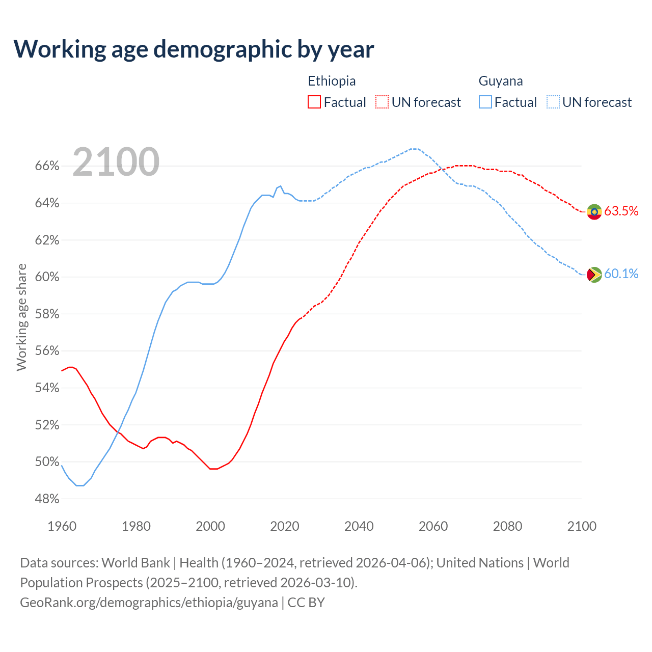 - Ethiopia has 80.7M working age adults (aged 15-64) vs 540K in Guyana.