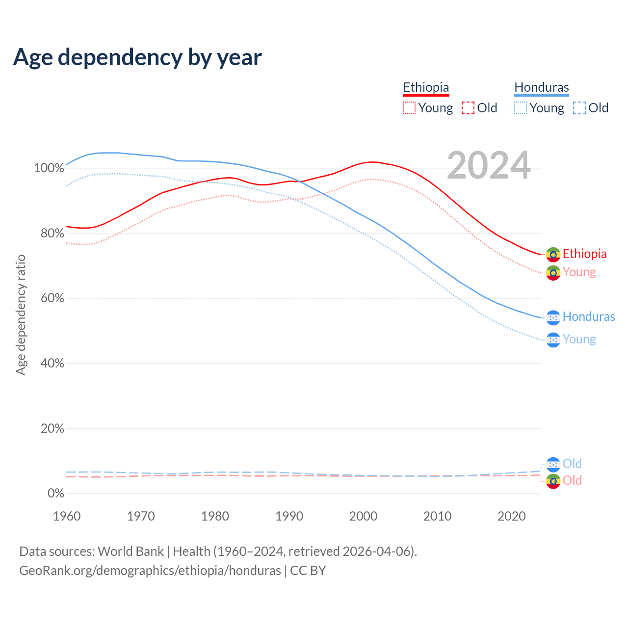 - Ethiopia is ranked 167/196 by median age (oldest to youngest) vs 134/196 for Honduras.