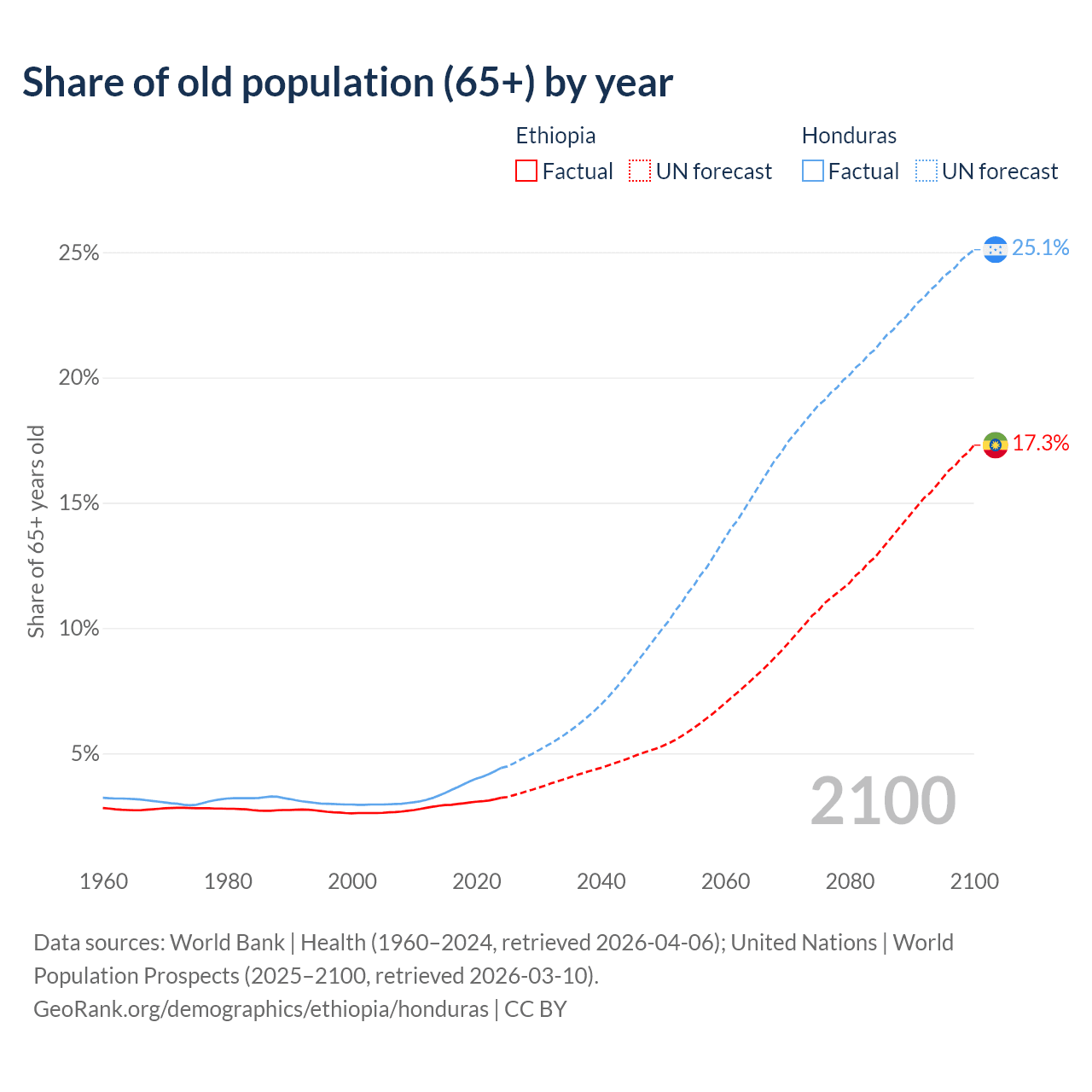 The share of older people aged 65 and over is 3.23% in Ethiopia and 4.42% in Honduras. Life expectancy in Ethiopia compared to Honduras .