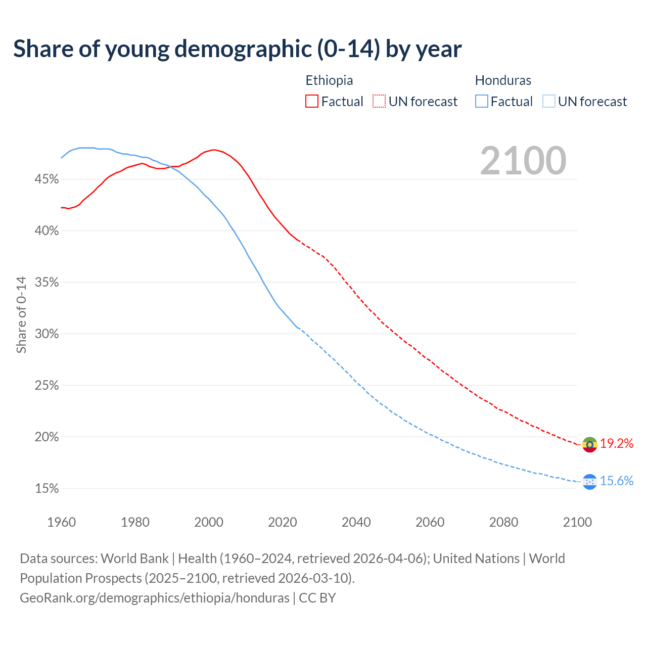 - The share of young demographic (0-15 years old) in Ethiopia is 39.1% vs 30.6% in Honduras.