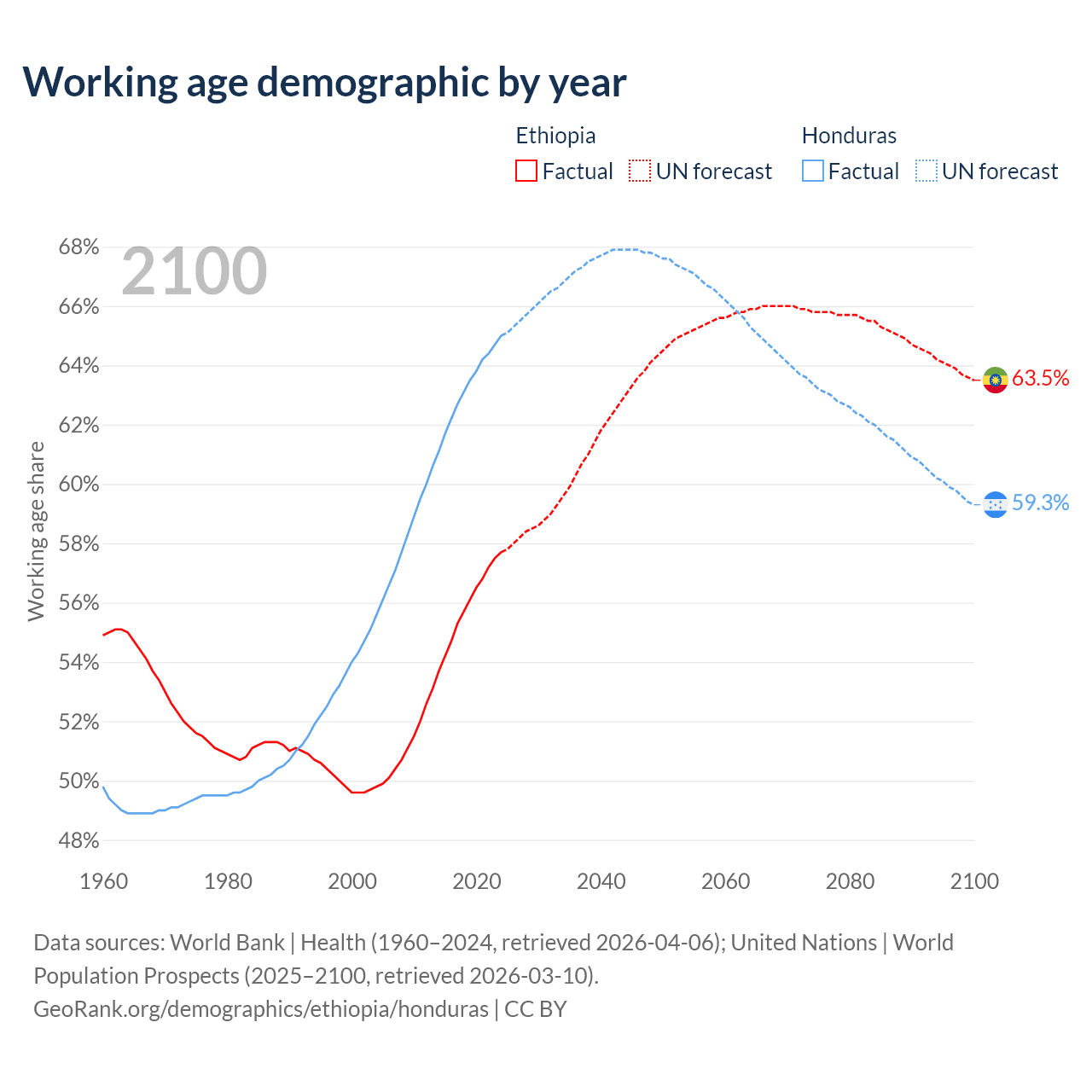 - As of 2026, the population of Ethiopia is 140M vs 11.2M in Honduras - 12.5 times difference.