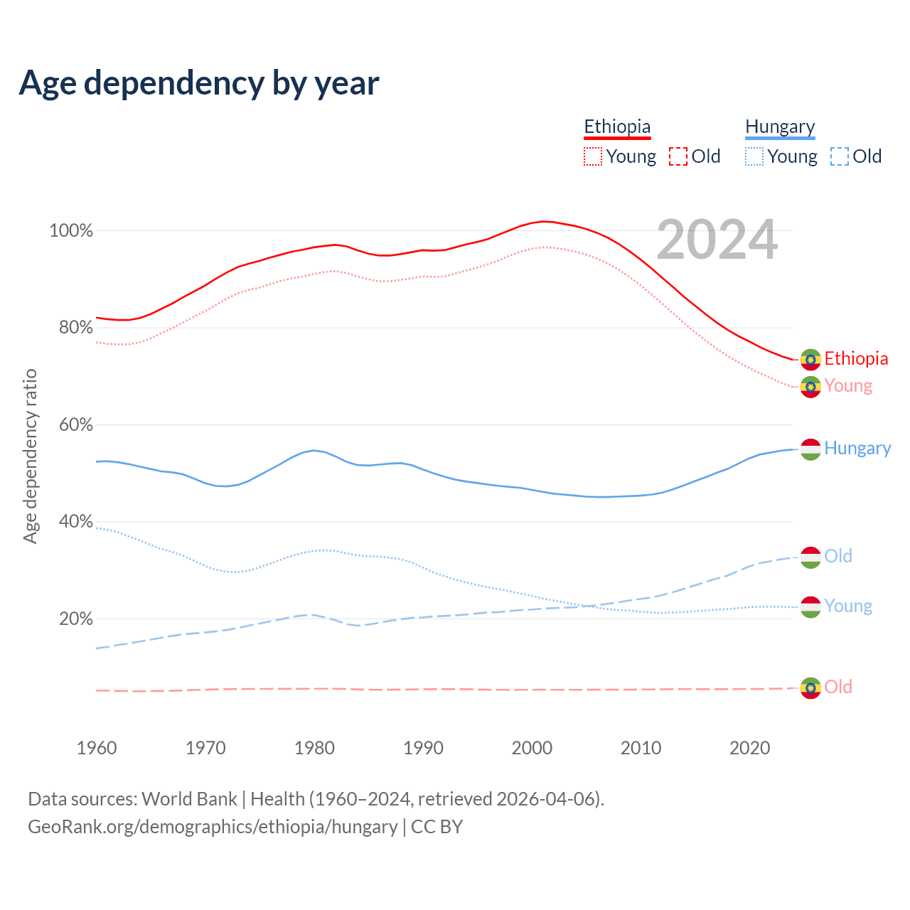 - Ethiopia is ranked 167/196 by median age (oldest to youngest) vs 17/196 for Hungary.