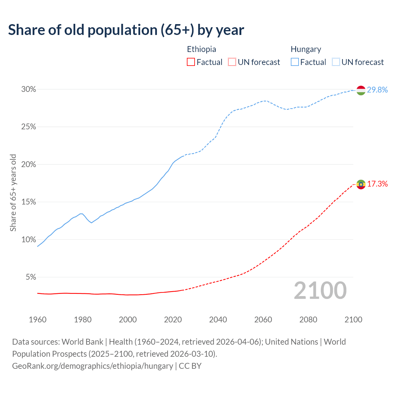 The share of older people aged 65 and over is 3.23% in Ethiopia and 21% in Hungary. Life expectancy in Ethiopia compared to Hungary .