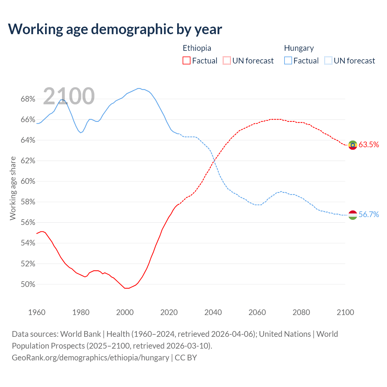 - Ethiopia has 80.7M working age adults (aged 15-64) vs 6.12M in Hungary.