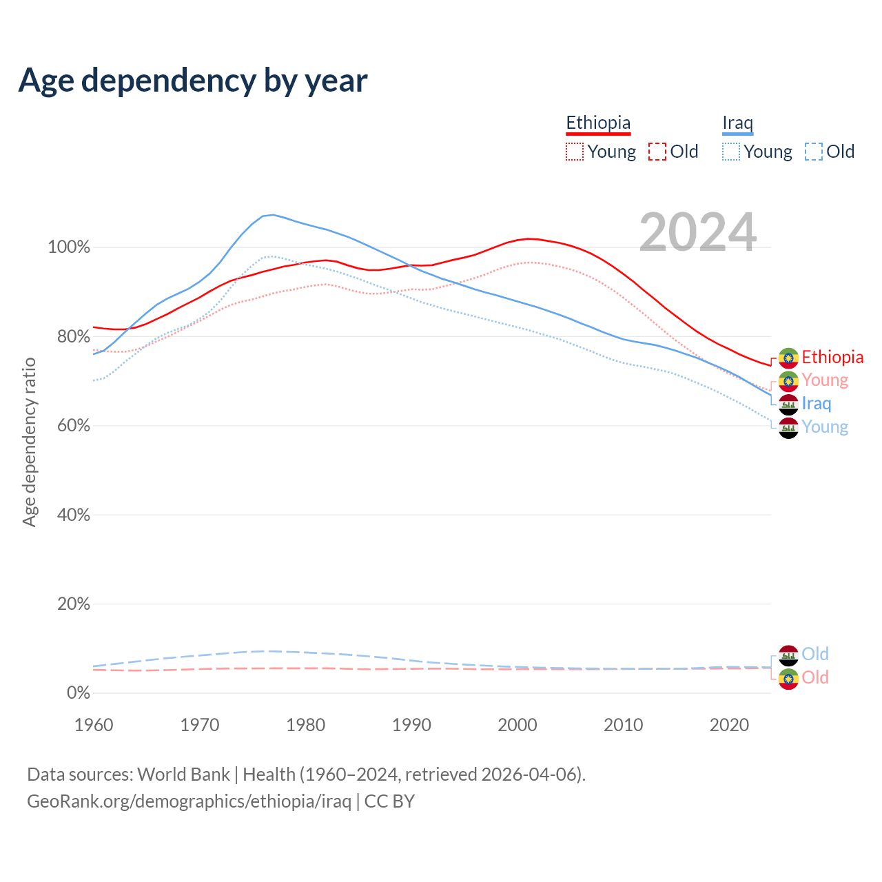 - The share of old-age demographic (65+) in Ethiopia is 3.23% vs 3.41% in Iraq.