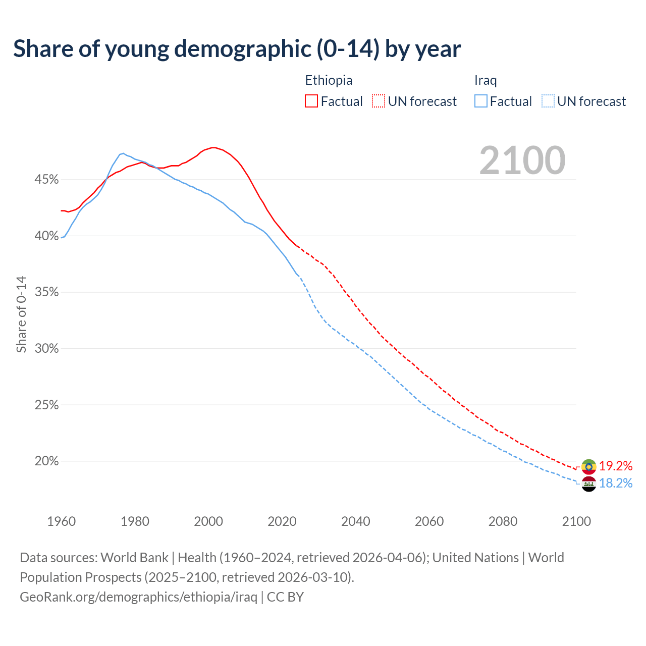 - The share of young demographic (0-15 years old) in Ethiopia is 39.1% vs 36.6% in Iraq.