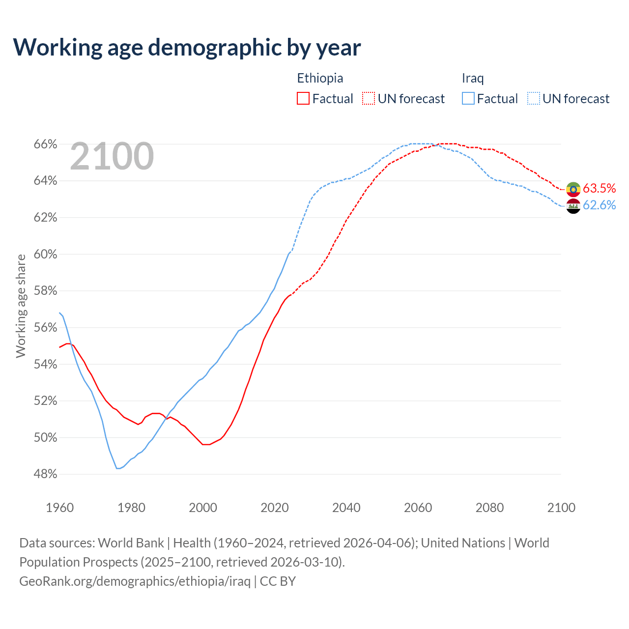 - Ethiopia has 80.7M working age adults (aged 15-64) vs 29M in Iraq.