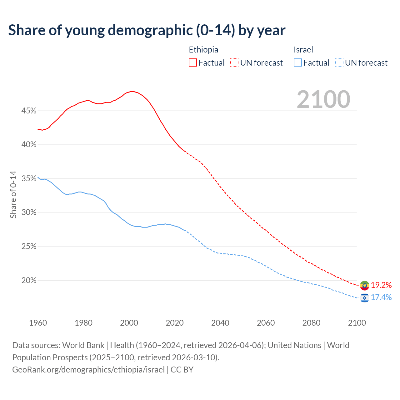 Median age Ethiopia vs Israel, 1960-2100
