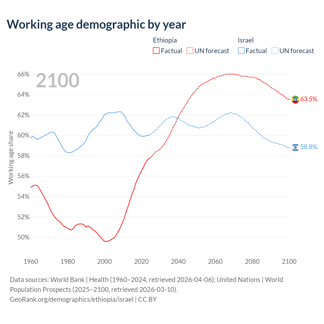 - Ethiopia has 80.7M working age adults (aged 15-64) vs 6.18M in Israel.