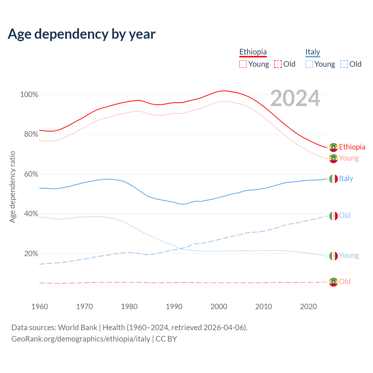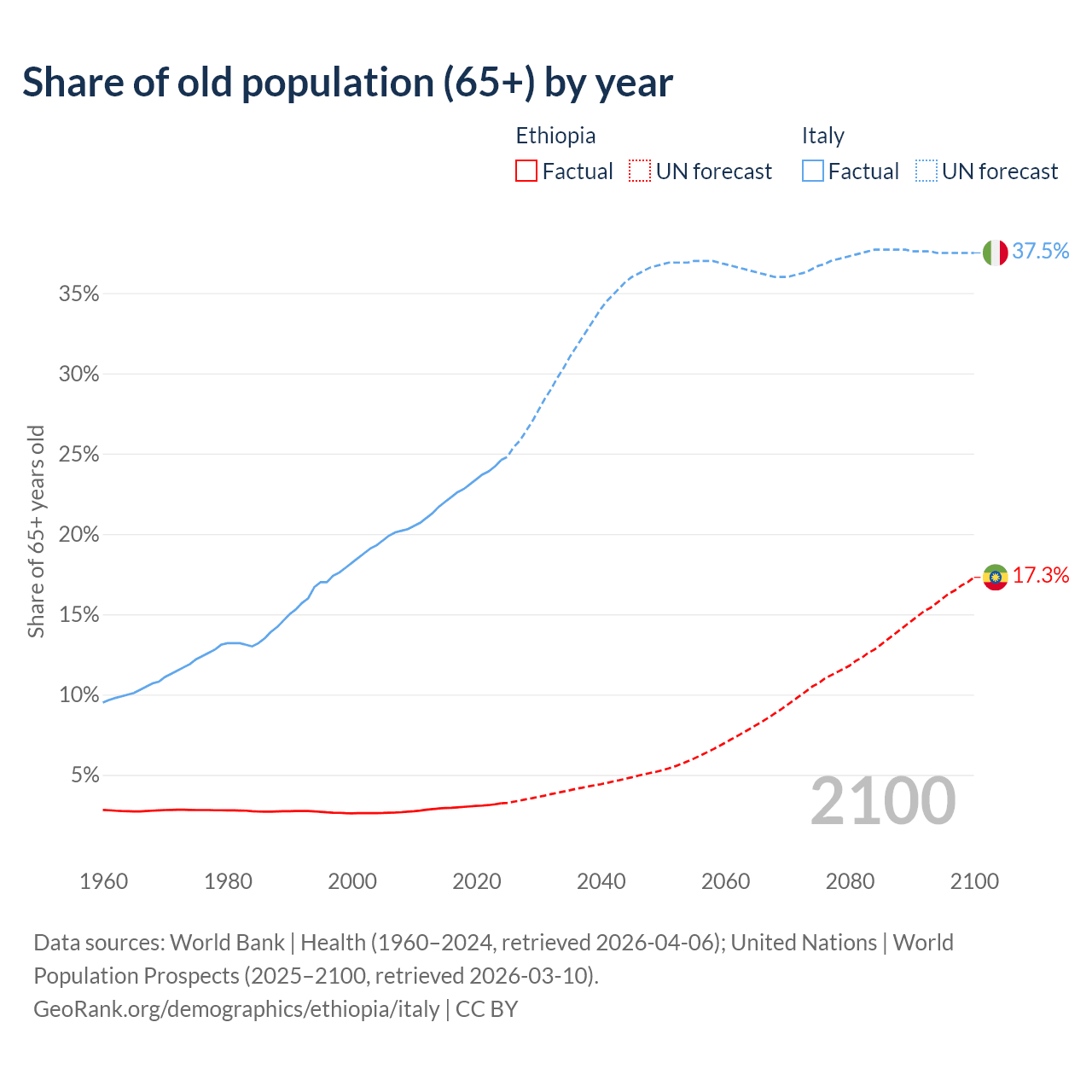 The share of older people aged 65 and over is 3.23% in Ethiopia and 24.6% in Italy. Life expectancy in Ethiopia compared to Italy .