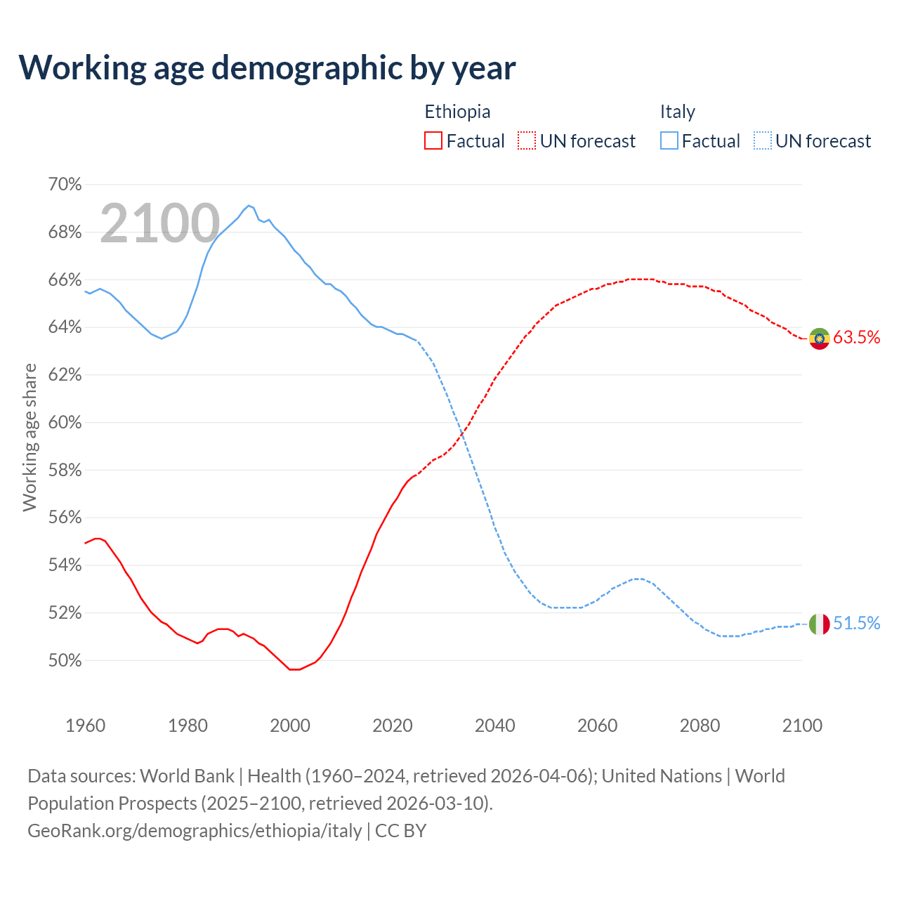 - Ethiopia has 80.7M working age adults (aged 15-64) vs 37.2M in Italy.