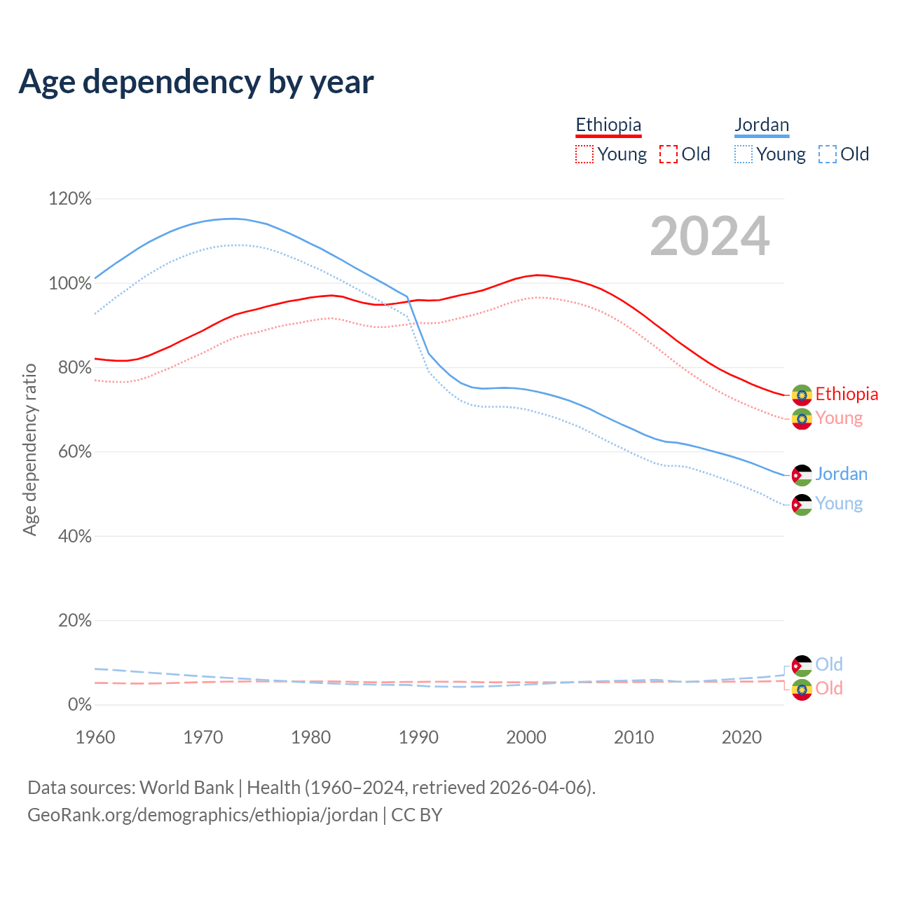 The share of older people aged 65 and over is 3.23% in Ethiopia and 4.52% in Jordan. Life expectancy in Ethiopia compared to Jordan .