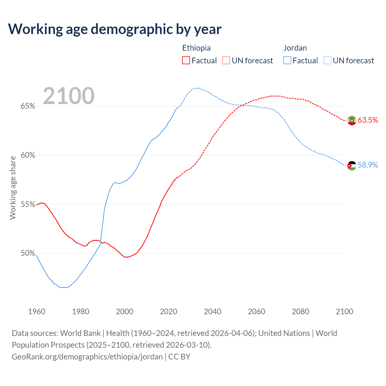 - Ethiopia has 80.7M working age adults (aged 15-64) vs 7.49M in Jordan.