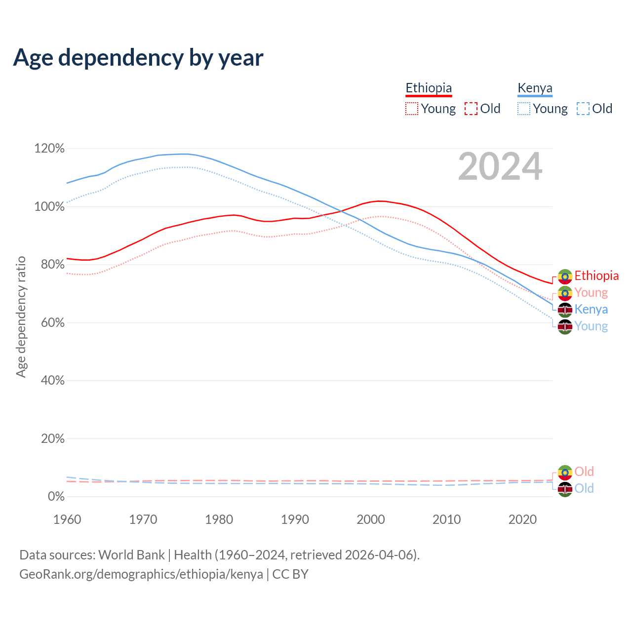 The share of older people aged 65 and over is 3.23% in Ethiopia and 2.97% in Kenya. Life expectancy in Ethiopia compared to Kenya .