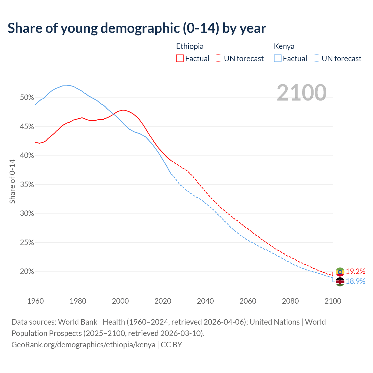 - As of 2026, the population of Ethiopia is 140M vs 59M in Kenya - 2.37 times difference.