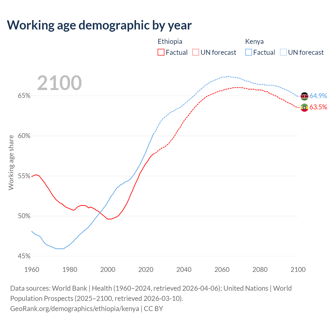 - Ethiopia has 80.7M working age adults (aged 15-64) vs 35.5M in Kenya.
