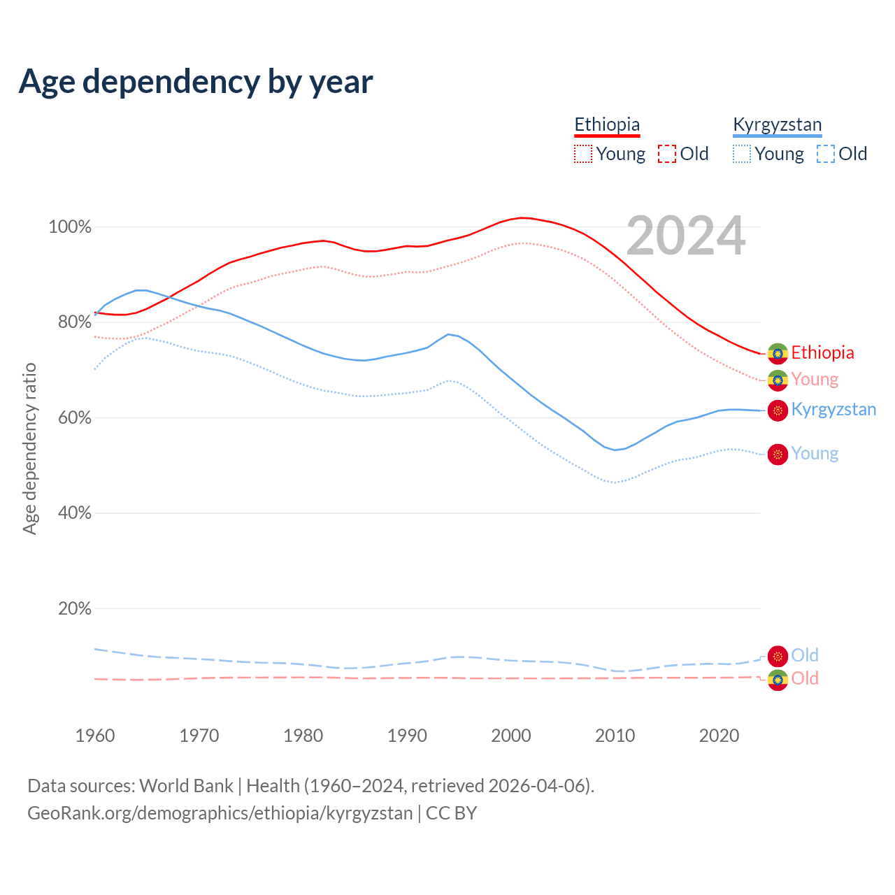 - The share of old-age demographic (65+) in Ethiopia is 3.23% vs 5.68% in Kyrgyzstan.