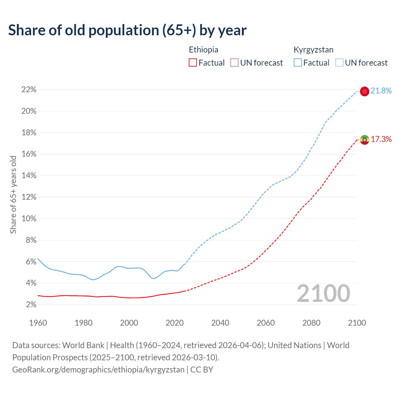 The share of older people aged 65 and over is 3.23% in Ethiopia and 5.68% in Kyrgyzstan. Life expectancy in Ethiopia compared to Kyrgyzstan .
