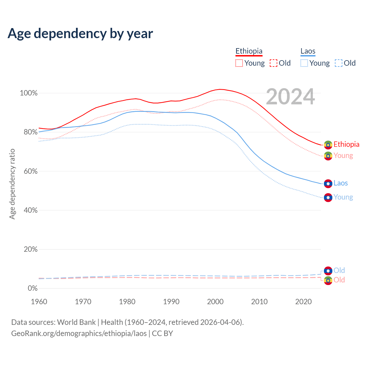 - Ethiopia is ranked 167/196 by median age (oldest to youngest) vs 130/196 for Laos.