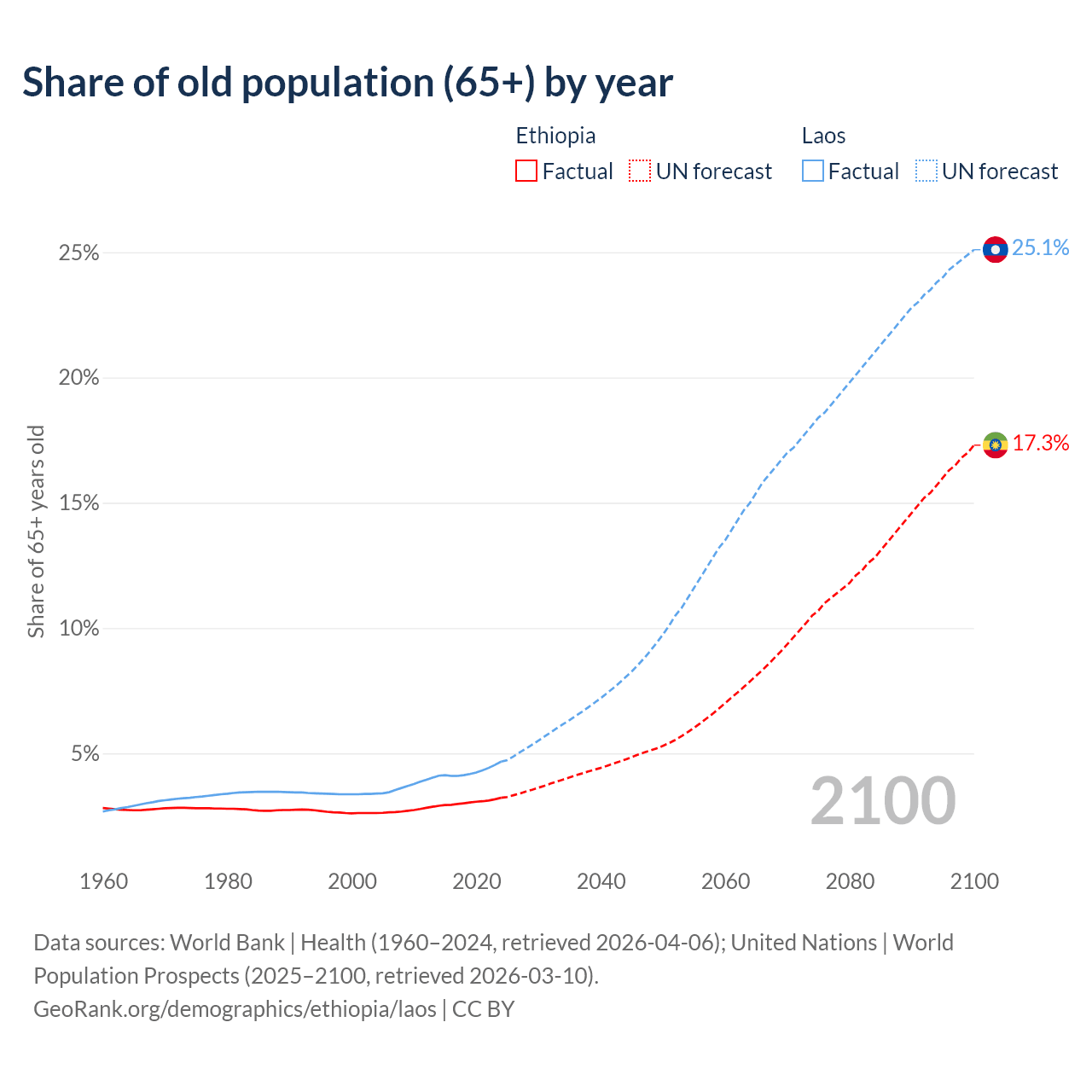 The share of older people aged 65 and over is 3.23% in Ethiopia and 4.67% in Laos. Life expectancy in Ethiopia compared to Laos .