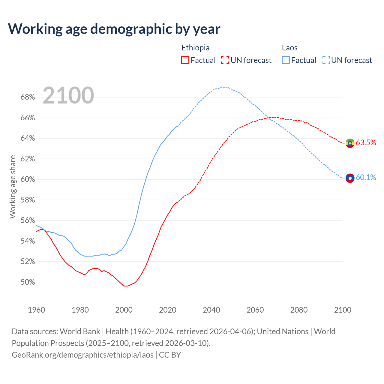 - Ethiopia has 80.7M working age adults (aged 15-64) vs 5.21M in Laos.
