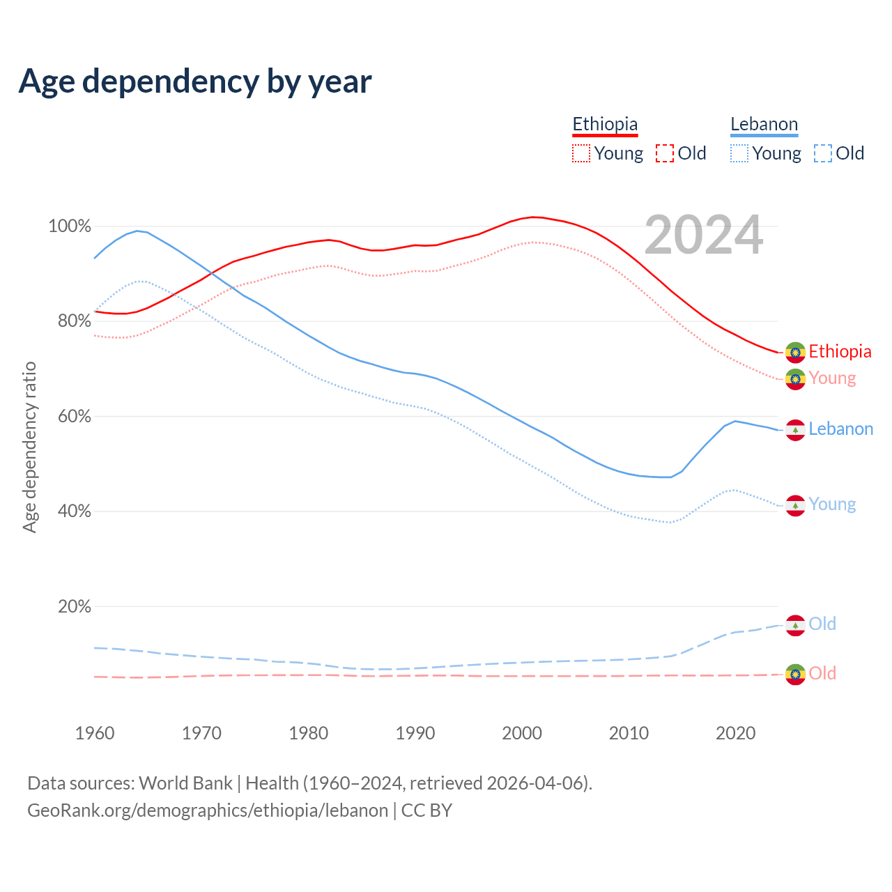 - Ethiopia is ranked 167/196 by median age (oldest to youngest) vs 106/196 for Lebanon.