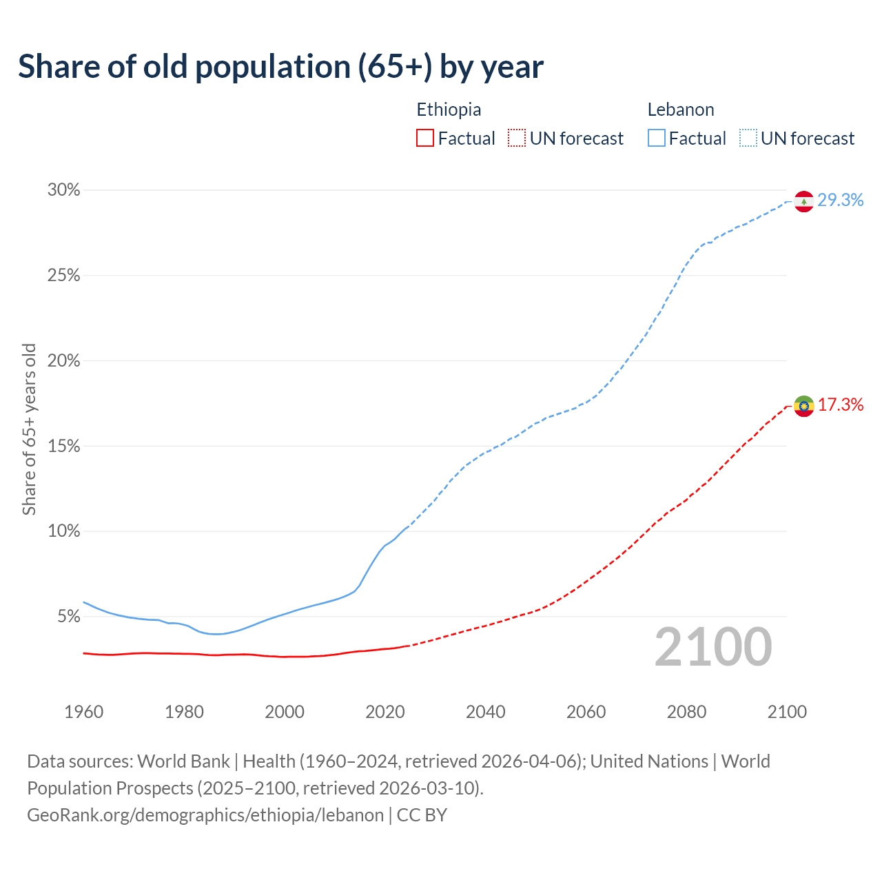 The share of older people aged 65 and over is 3.23% in Ethiopia and 10.1% in Lebanon. Life expectancy in Ethiopia compared to Lebanon .