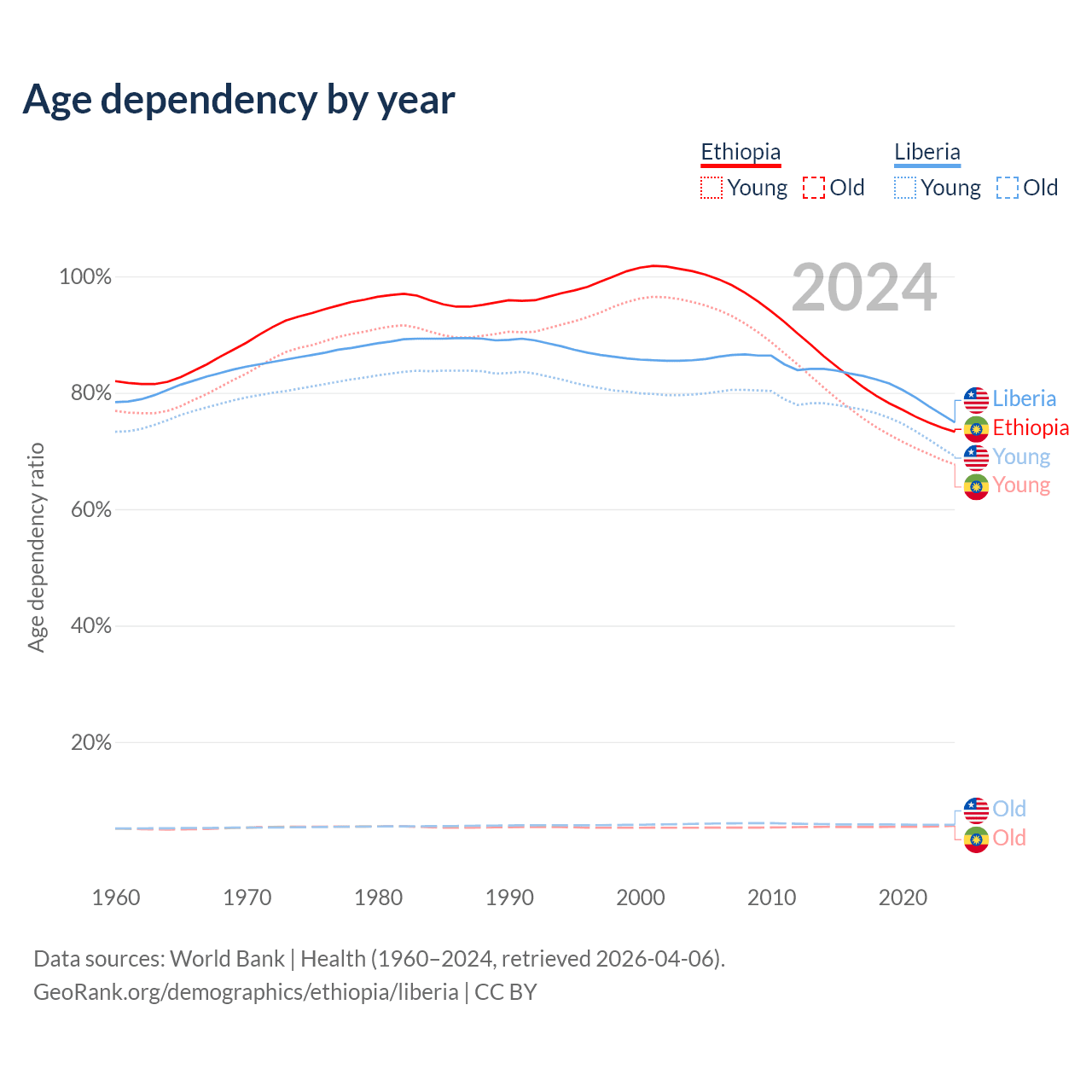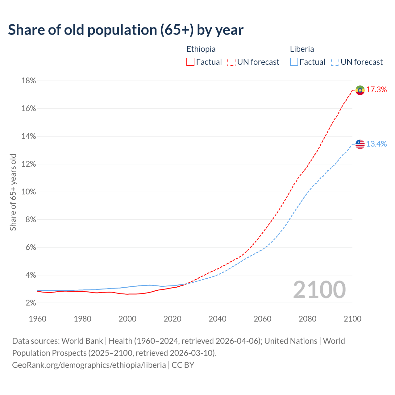 - The share of old-age demographic (65+) in Ethiopia is 3.23% vs 3.3% in Liberia.