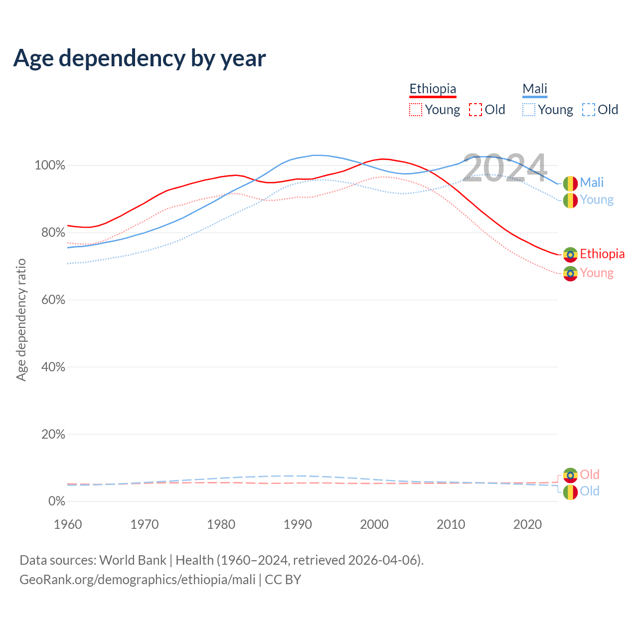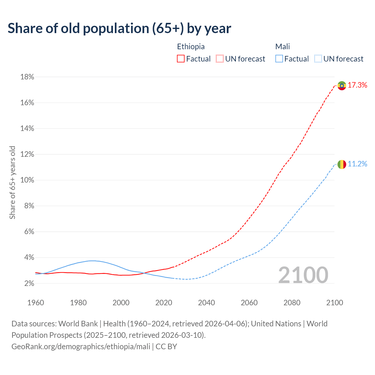 The share of older people aged 65 and over is 3.23% in Ethiopia and 2.38% in Mali. Life expectancy in Ethiopia compared to Mali .