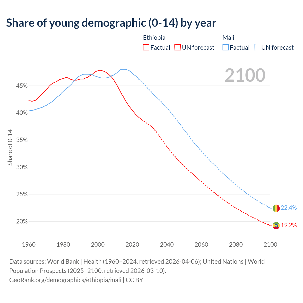 - The share of young demographic (0-15 years old) in Ethiopia is 39.1% vs 46.1% in Mali.