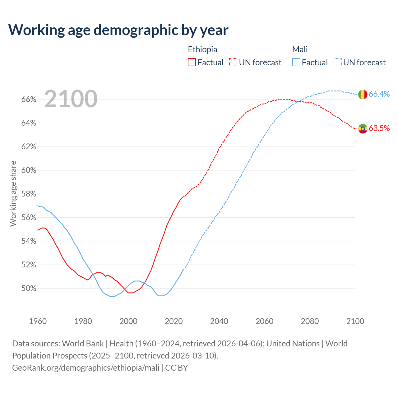 - Ethiopia has 80.7M working age adults (aged 15-64) vs 13.5M in Mali.