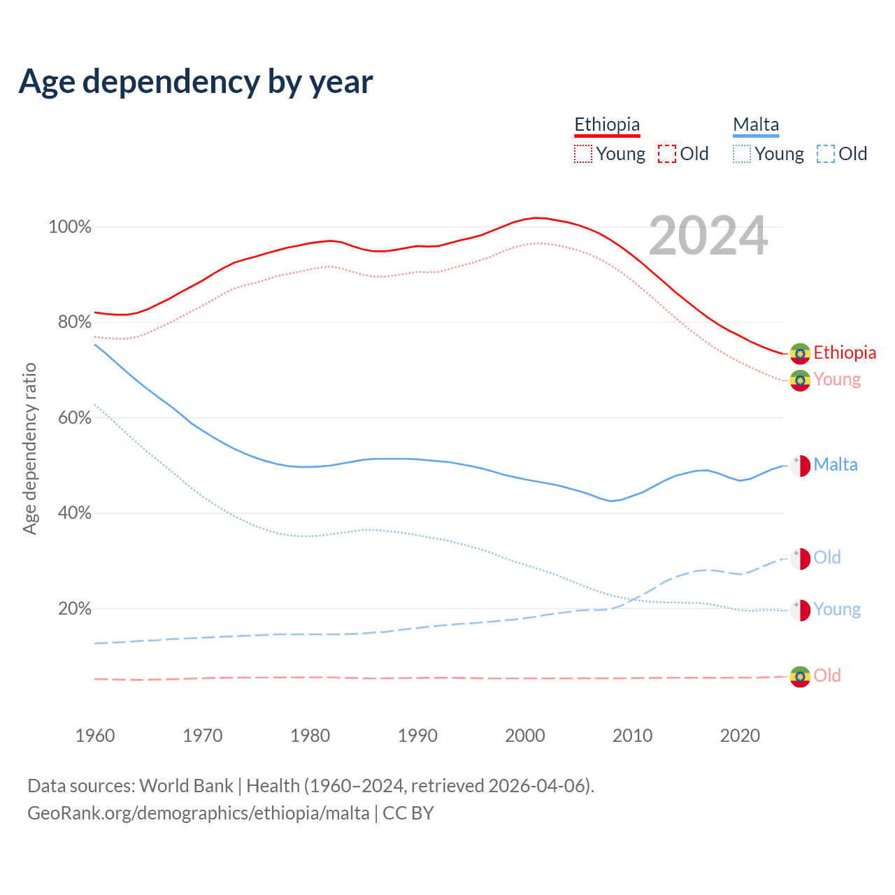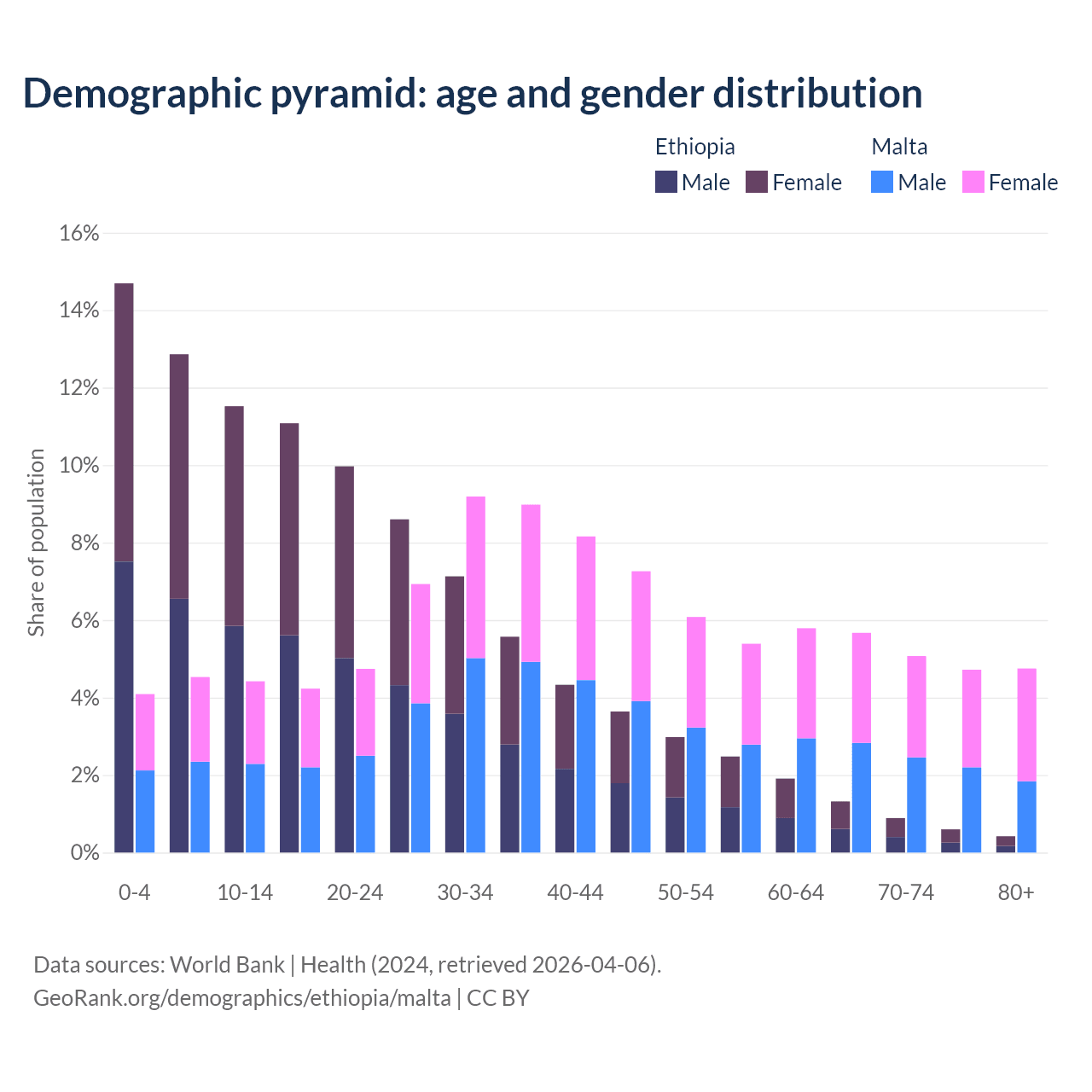 - Ethiopia is ranked 167/196 by median age (oldest to youngest) vs 36/196 for Malta.