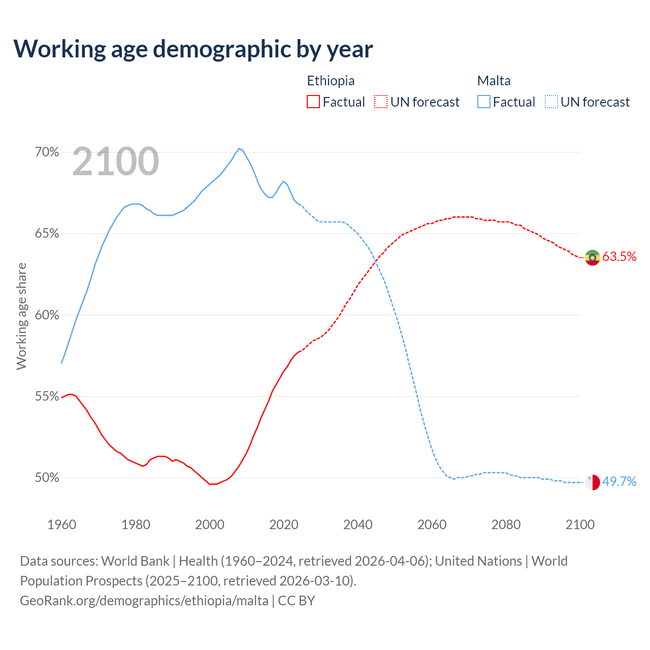 - Ethiopia has 80.7M working age adults (aged 15-64) vs 388K in Malta.