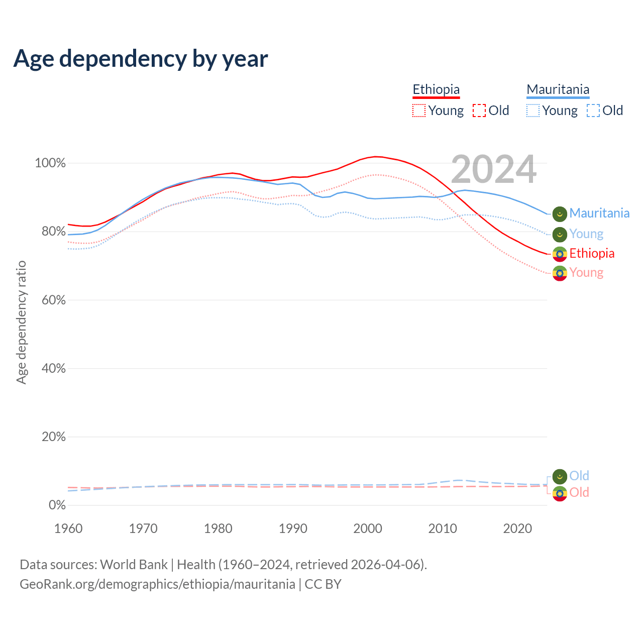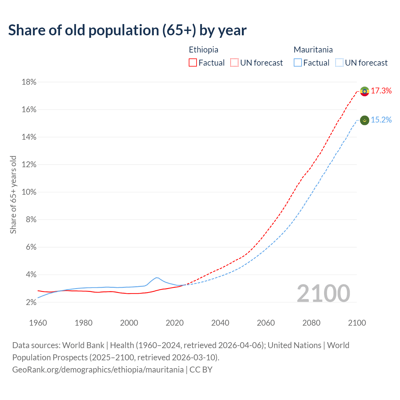 - The share of old-age demographic (65+) in Ethiopia is 3.23% vs 3.23% in Mauritania.