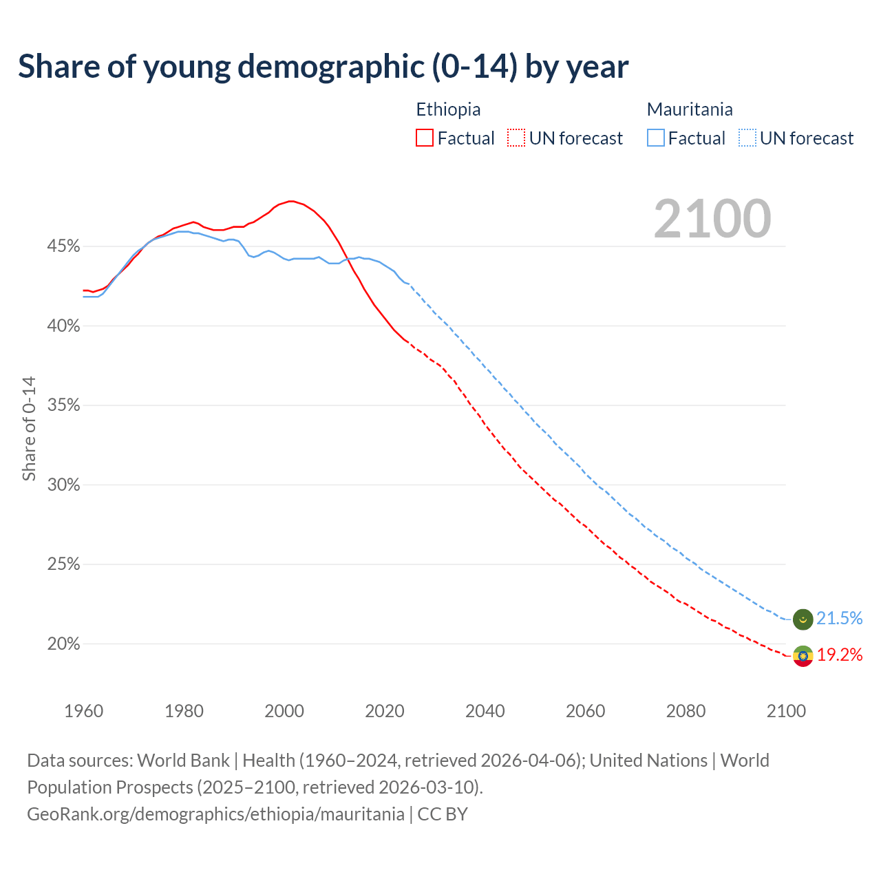 - The share of young demographic (0-15 years old) in Ethiopia is 39.1% vs 42.7% in Mauritania.