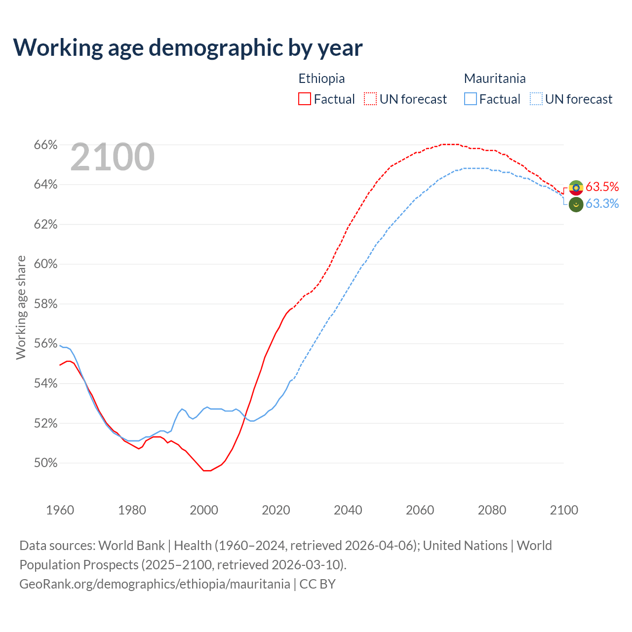 - Ethiopia has 80.7M working age adults (aged 15-64) vs 2.98M in Mauritania.