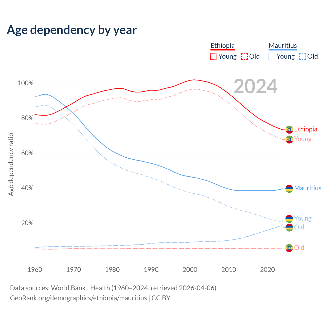 - Ethiopia is ranked 167/196 by median age (oldest to youngest) vs 57/196 for Mauritius.