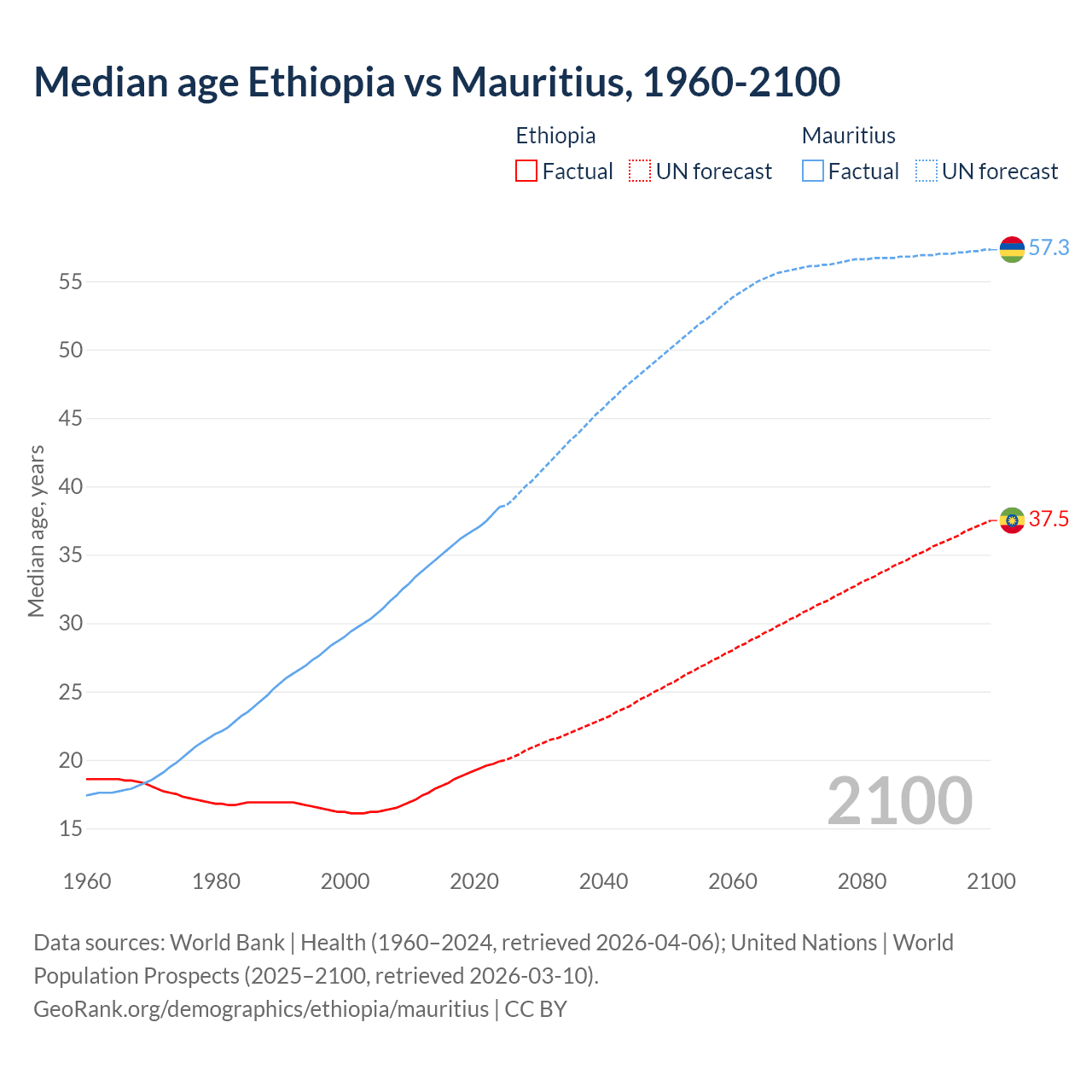 Median age Ethiopia vs Mauritius, 1960-2100