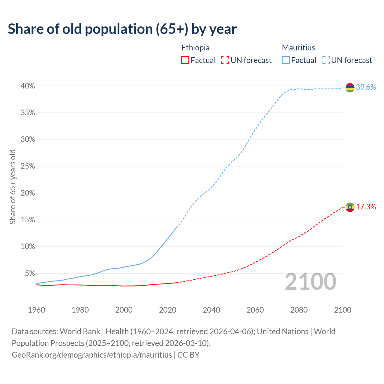 The share of older people aged 65 and over is 3.23% in Ethiopia and 13.5% in Mauritius. Life expectancy in Ethiopia compared to Mauritius .
