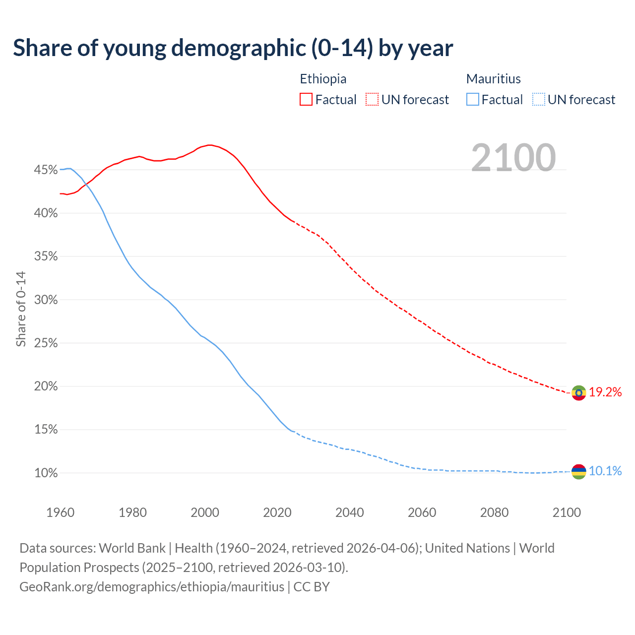 - The share of young demographic (0-15 years old) in Ethiopia is 39.1% vs 14.8% in Mauritius.
