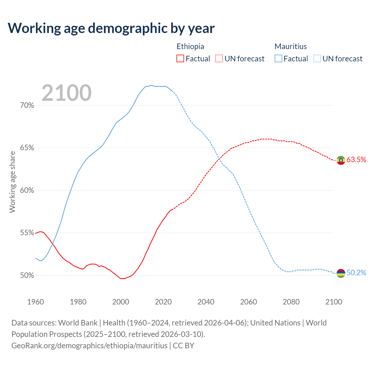 - Ethiopia has 80.7M working age adults (aged 15-64) vs 889K in Mauritius.