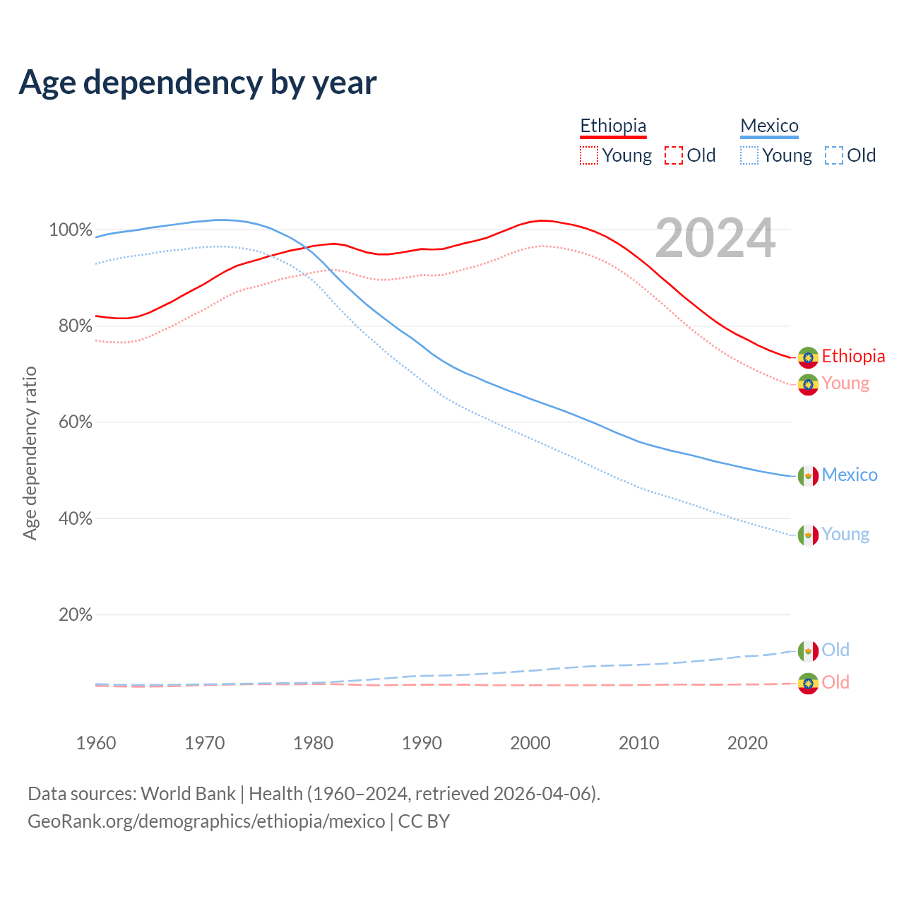- Ethiopia is ranked 167/196 by median age (oldest to youngest) vs 102/196 for Mexico.