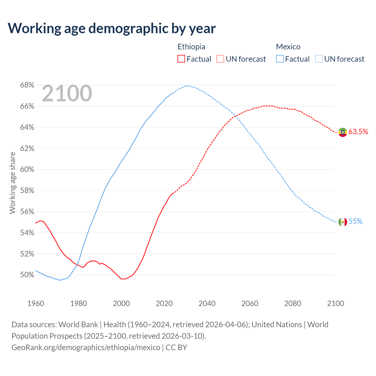 - Ethiopia has 80.7M working age adults (aged 15-64) vs 89.6M in Mexico.
