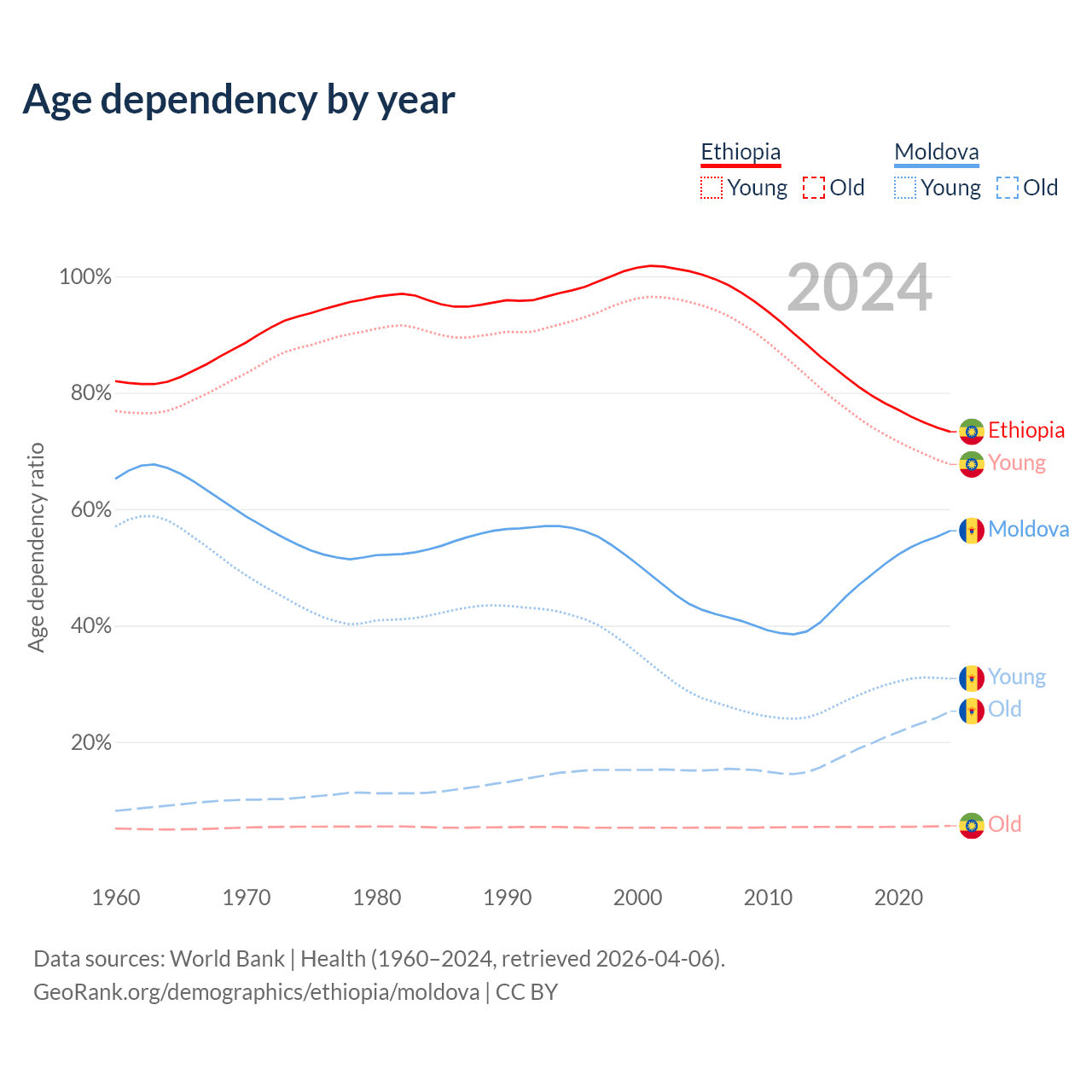 - The share of old-age demographic (65+) in Ethiopia is 3.23% vs 16.2% in Moldova.