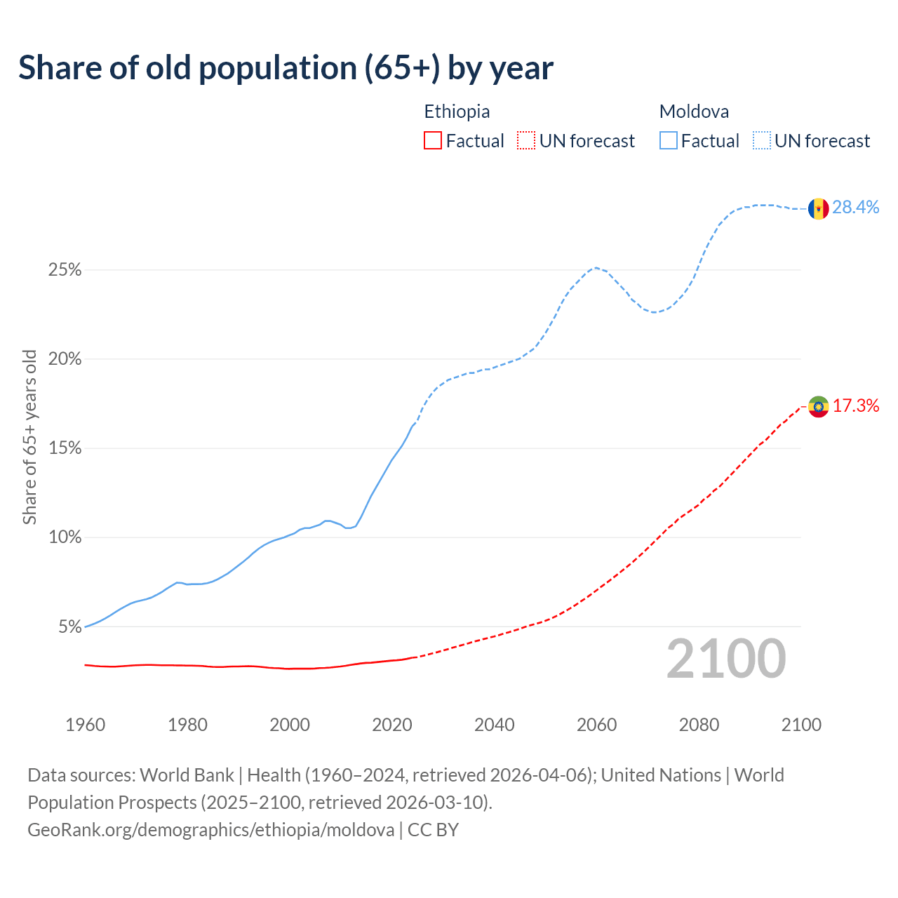 The share of older people aged 65 and over is 3.23% in Ethiopia and 16.2% in Moldova. Life expectancy in Ethiopia compared to Moldova .