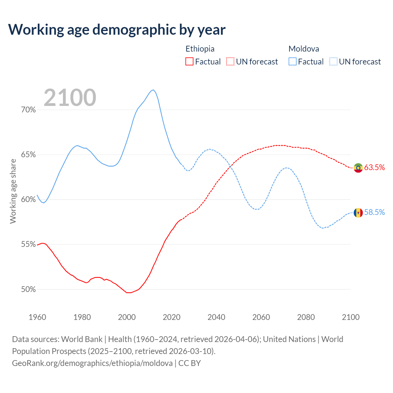Median age Ethiopia vs Moldova, 1960-2100