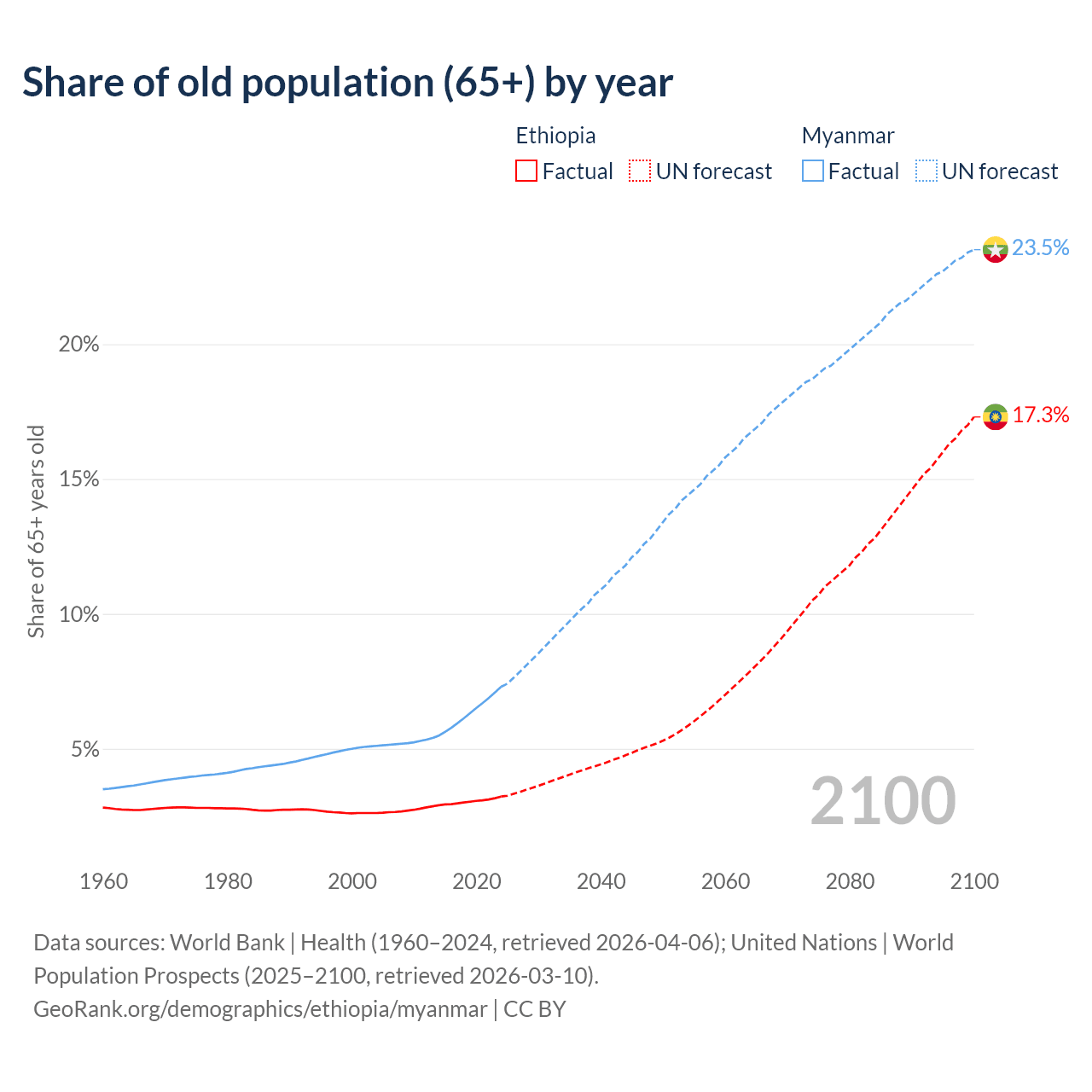 The share of older people aged 65 and over is 3.23% in Ethiopia and 7.3% in Myanmar. Life expectancy in Ethiopia compared to Myanmar .