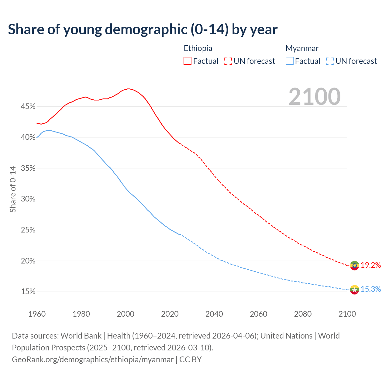 - The share of young demographic (0-15 years old) in Ethiopia is 39.1% vs 24.3% in Myanmar.