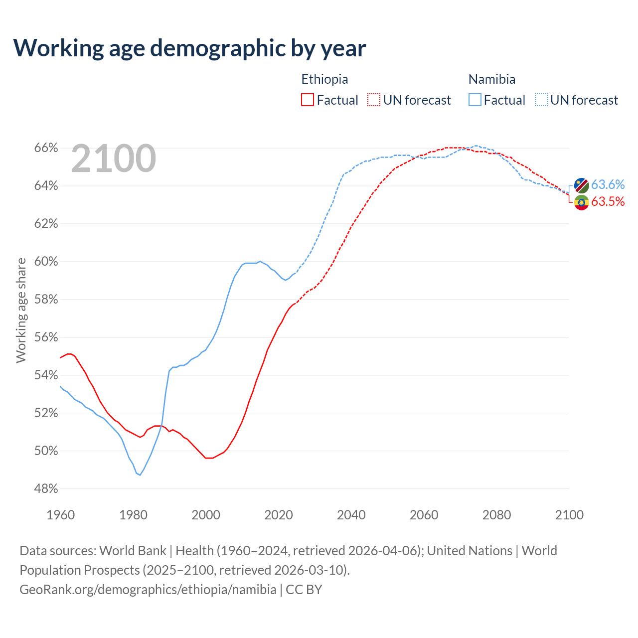 - Ethiopia has 80.7M working age adults (aged 15-64) vs 1.88M in Namibia.