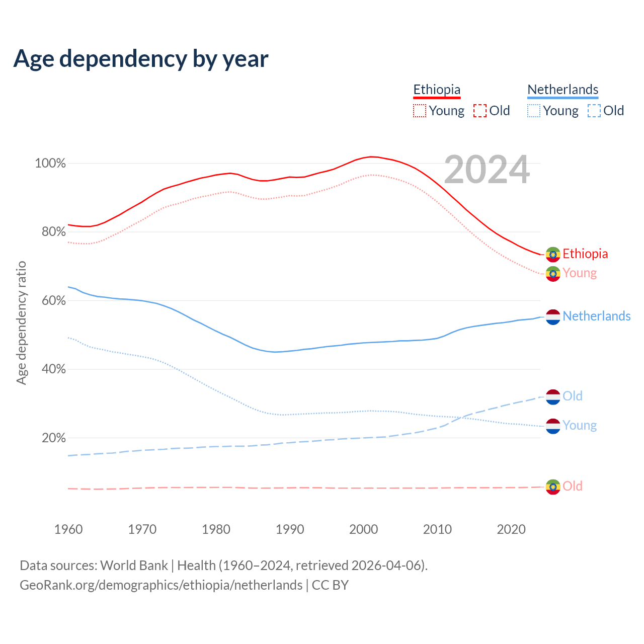 - Ethiopia is ranked 167/196 by median age (oldest to youngest) vs 33/196 for the Netherlands.